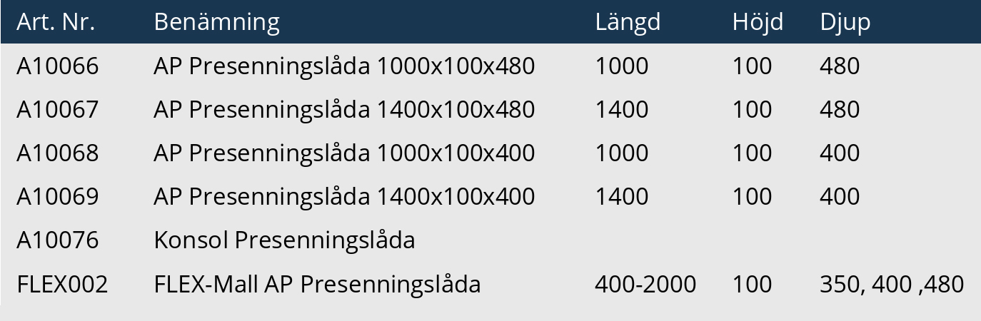 Utöver standarddimensioner erbjuder vi även en flexibel lösning (FLEX) där du kan anpassa längd och djup efter behov inom angivna måttintervall. Det gör det möjligt att optimera installationen utifrån fordon och användningsområde.